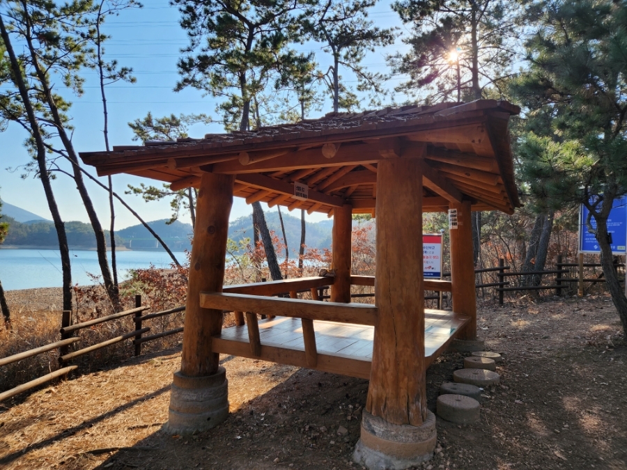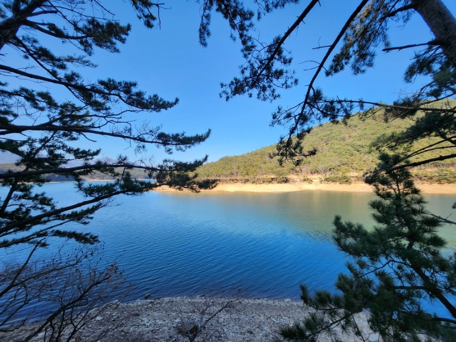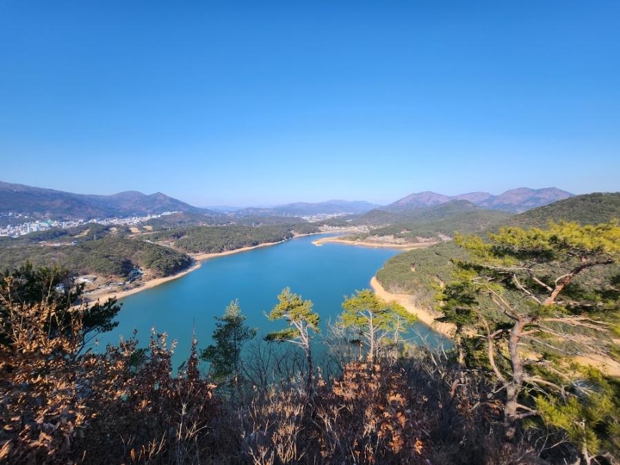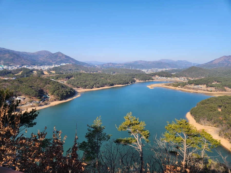 헉! 정상에 도착하니 회동수원지가 한눈에 보이고... 너무 예뻐서 눈을 뗄 수가 없다. 사진으로는 다 담을 수가 없으니 안타깝다.