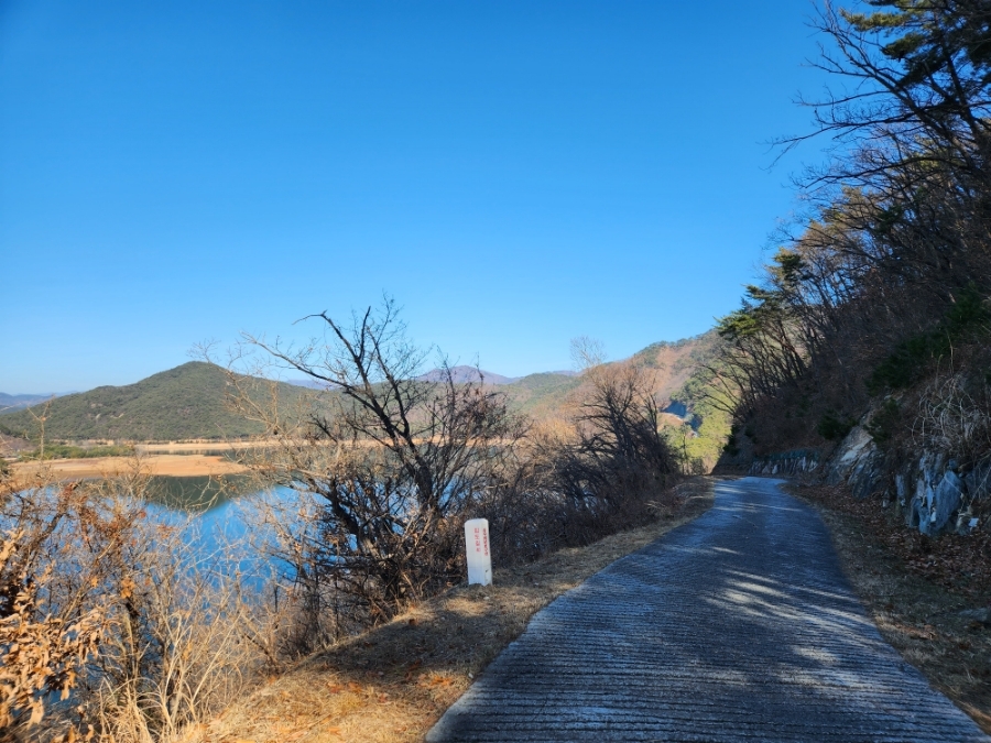 한참을 내려오니 표식이 보이는데 왼쪽으로 가야 저수지를 둘러 걸을 수 있고 거리도 짧다. 난 왼쪽으로.
