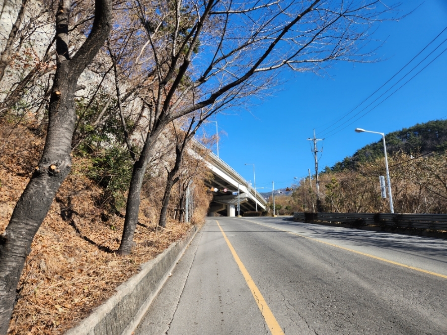 버스에서 내려서 오른쪽으로 고개를 돌리면 동천교가 다리가 보인다. 이 다리를 지나 계속 앞으로 직진을 하면 된다. 계속 약간의 오르막길이다.